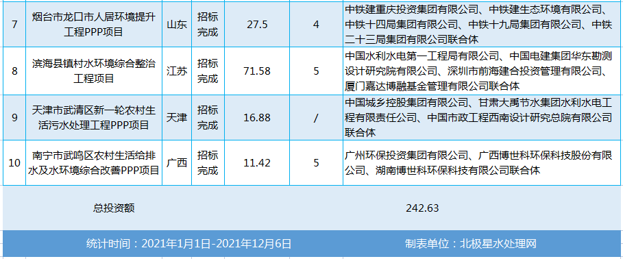 这10大项目中,最大一单则为滨海县镇村水环境综合整治工程项目,总投资高达71.58亿元,被中国水利水电第一工程局有限公司、中国电建集团华东勘测设计研究院有限公司、深圳市前海建合投资管理有限公司、厦门嘉达博融基金管理有限公司联合体拿下。(详情点击:)