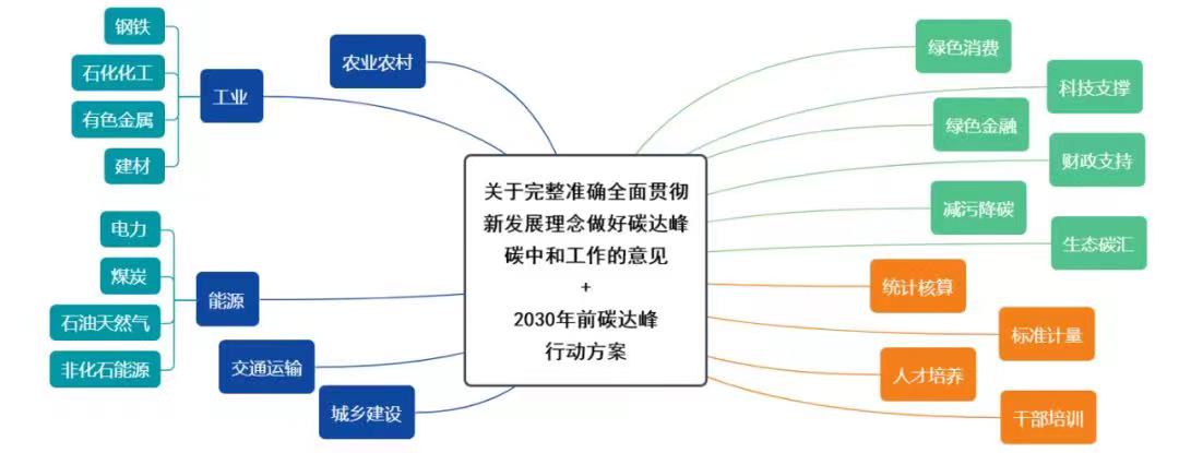 目前碳达峰碳中和“1+N”政策体系已初步构建,其中“1”包括《关于完整准确全面贯彻新发展理念做好碳达峰碳中和工作的意见》《2030年前碳达峰行动方案》两个顶层设计文件。“N”包括5大重点领域和6大重点行业碳达峰实施方案,以及人才培养等10大碳达峰碳中和支撑保障方案。
