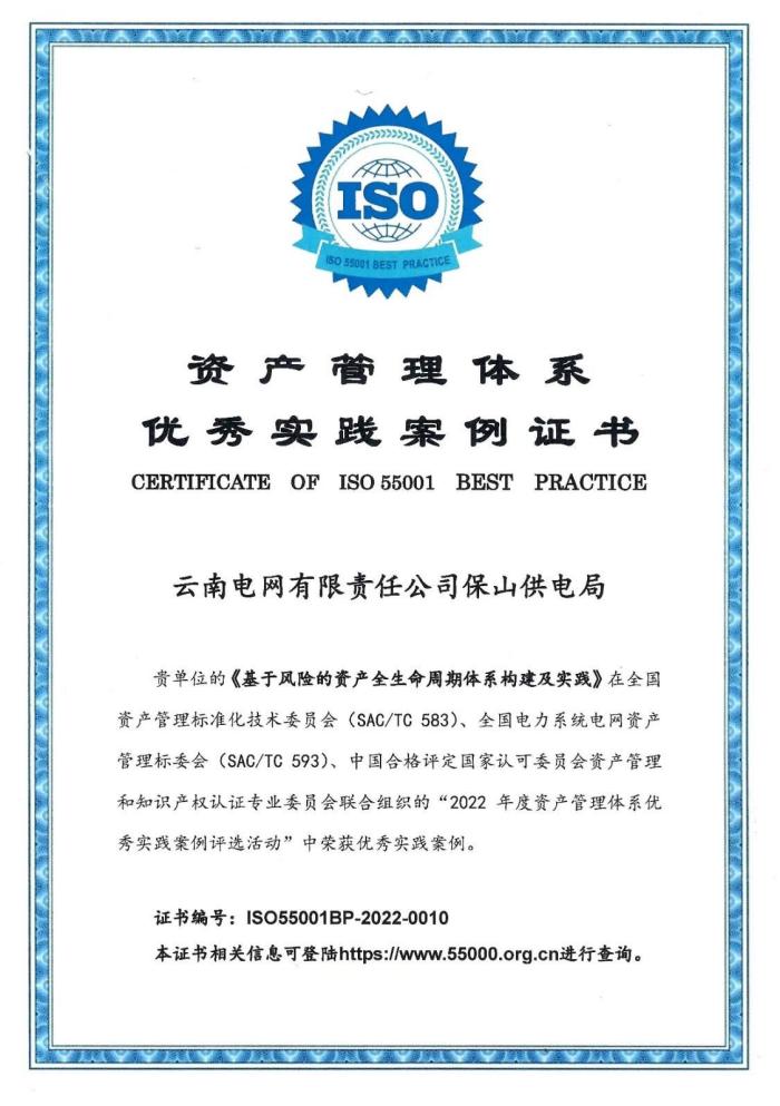 保山供电局自2020年开始率先开展资产管理体系建设,历时三载接续奋进,先后荣获2020年度省公司董事长嘉奖,2021年度电力科技创新成果奖和2022年度资产管理体系优秀实践案例证书。保山供电局作为云南电网第一批资产管理体系建设和认证的试点单位,成为南方电网下属企业中首家通过IntertekISO55001资产管理体系认证的地市供电局,成为电力行业资产管理体系建设的标杆,具有良好的示范效应。