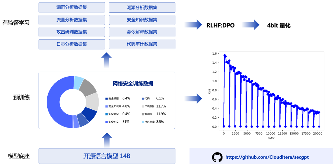 目前,SecGPT不仅开源了基座模型,还开源了所有的训练代码以及数据(包括预训练,有监督训练,DPO训练等大模型全流程训练代码)和网络安全训练数据。我们鼓励任何人都使用这些代码和数据去训练自己的网络安全大模型!该模型的训练过程大致如下图所示:
