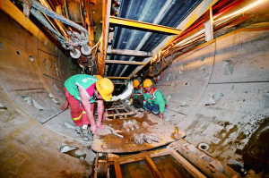 坐车“滑行”入黑魆魆的“龙”号管线内,3.5米内径的管道内部显得有些逼仄,未来,收集的污水将从这个管道里流过,输送到水厂里。目前,“龙”号盾构机已经掘进到了全长1.5公里的1公里处,还剩下0.5公里需要“拼搏”。