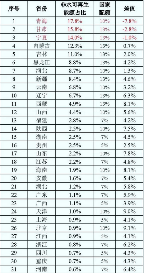 根据国家统计局数据,各省发电量中的非水可再生能源占比情况如表1所示。