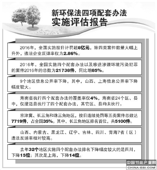 《报告》认为,新《环境保护法》四个配套办法实施初显成效,去年一年,全国实施按日计罚超过8亿元,除了四类案件数量大幅上升外,违法企业反弹率仅为2.86%。