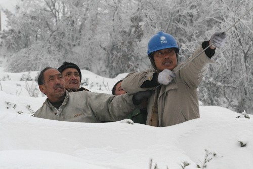 1月22日,安徽金寨县张冲供电所职工在野外架设临时居民用电线路。1月17日,三峡电力外送华东的重要输电线路――500千伏宜华直流输电线路位于安徽霍山县和金寨县境内的4座线塔严重受损,造成金寨县张冲乡部分地区的居民用电线路短路。