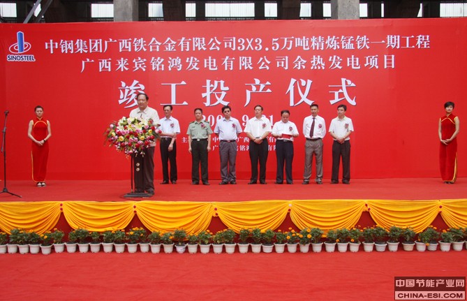 中钢集团广西铁合金有限公司12MW锰硅铁合金矿热炉烟气余热发电机于2009年9月21竣工投入运行, 作为全国重点锰系铁合金生产企业,中钢广西铁合金有限公司把降低铁合金综合能耗、合理用能放在重中之重,于2006年元月开始进行烟气余热利用研究,2009年9月上旬,系统设备及1号、2号余热蒸汽锅炉热调试成功,9月21日发电机组成功并网发电。投入运行以来,节能效果显著,达到提高产量、降低能耗、提高锰金属回收率的目的。同时该公司安装了余热发电设备的矿热炉除尘设备,运行能耗降低15-25%,除尘布袋消耗量减少50%以上。