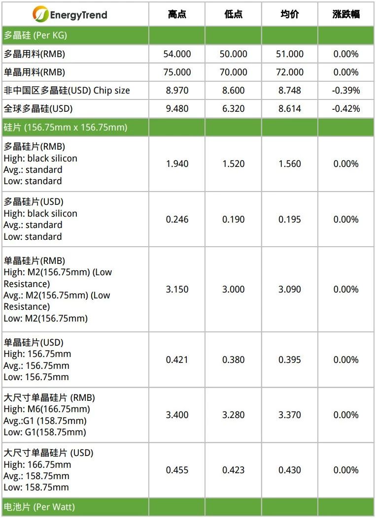 国内156.75mm多晶硅片产品维持不变在1.52~1.56RMB/Pc,黑硅产品维持不变在1.94RMB/Pc,铸锭单晶产品维持不变在2.60~2.65RMB/Pc。156.75mm单晶硅片产品维持不变在3.00~3.13RMB/Pc,大尺寸158.75mm单晶硅片产品维持不变在3.28~3.37RMB/Pc,166.75mm单晶硅片产品尺寸维持不变在3.40RMB/Pc。