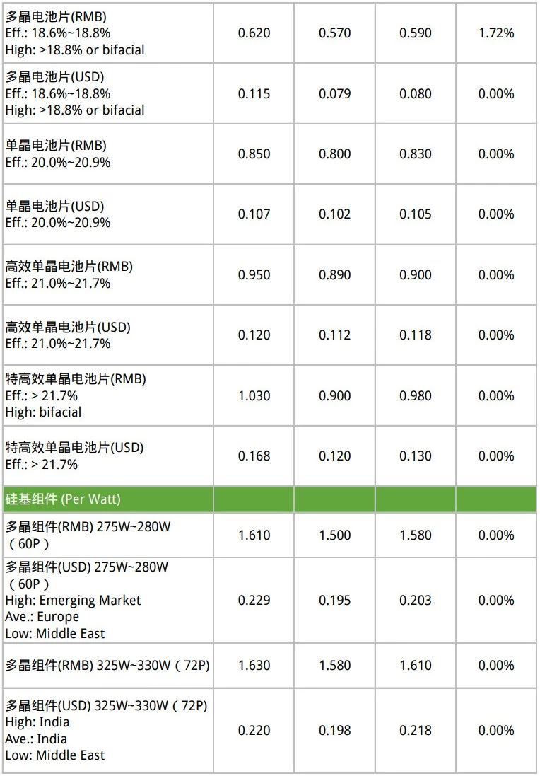 国内一般多晶电池片上调区间至0.57~0.59RMB/W,高效多晶电池片上调至0.62RMB/W,一般单晶电池片维持不变在0.80~0.85RMB/W,高效单晶电池片维持不变在0.89~0.95RMB/W,特高效单晶(>21.7%)电池片维持不变在0.90~0.98RMB/W。双面特高效单晶(>21.7%)电池片维持不变在1.03RMB/W。