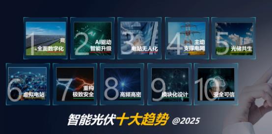智能光伏十大趋势为:全面数字化、AI驱动智能升级、电站无人化、主动支撑电网、光储共生、虚拟电站、重构极致安全、高频高密、模块化设计、安全可信。