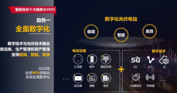 全面数字化:数字技术与光伏技术融合,使运维、生产管理和资产管理变得极简、智能、高效,预计到2025年全球90%的电站实现全面数字化。