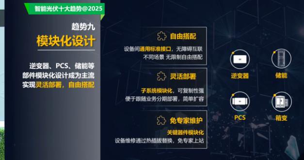 模块化设计:模块化是整个设备设计的最好形势,会使整个设计,逆变器、PCS、储能等部件模块化设计成为主流,得灵活性到最大的发挥,电量使用度也达到最高,实现免专家维护,设备维修通过热插拔替换,降低运维成本。