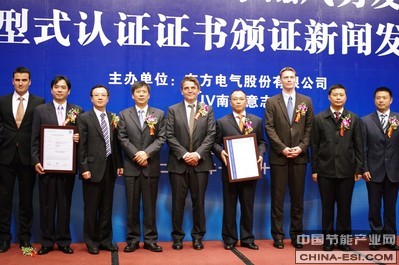 2011年10月20日,东方电气集团东方电机有限公司独资子公司东方电气新能源设备(杭州)有限公司公司(以下简称“新能源公司”)生产的DF82-1500直驱永磁风力发电机组通过TUV 南德意志集团(以下简称“TUV SUD”)按照 GL 导则进行的 A 级设计评估和型式认证,颁证仪式在北京国际风能大会暨展览会期间举行。TUV 南德意志集团风能部经理 Martin Webhofer博士和 TUV SUD大中华集团副总裁Wolfgang Hübl先生在仪式中分别向新能源公司技术开发部部长郑北超先生及新能源公司总经理詹明先生颁发了设计认证和型式认证证书。TUV SUD 大中华集团高级副总裁金灿先生、TUV SUD风能部总经理Ernst Donislreiter先生、东方电气集团党组成员、副总经理朱元巢先生、东方电气集团东方电机有限公司总经理贺建华先生、东方电机有限公司副总经理、新能源公司董事长兰向军先生等出席并且见证了本次仪式。