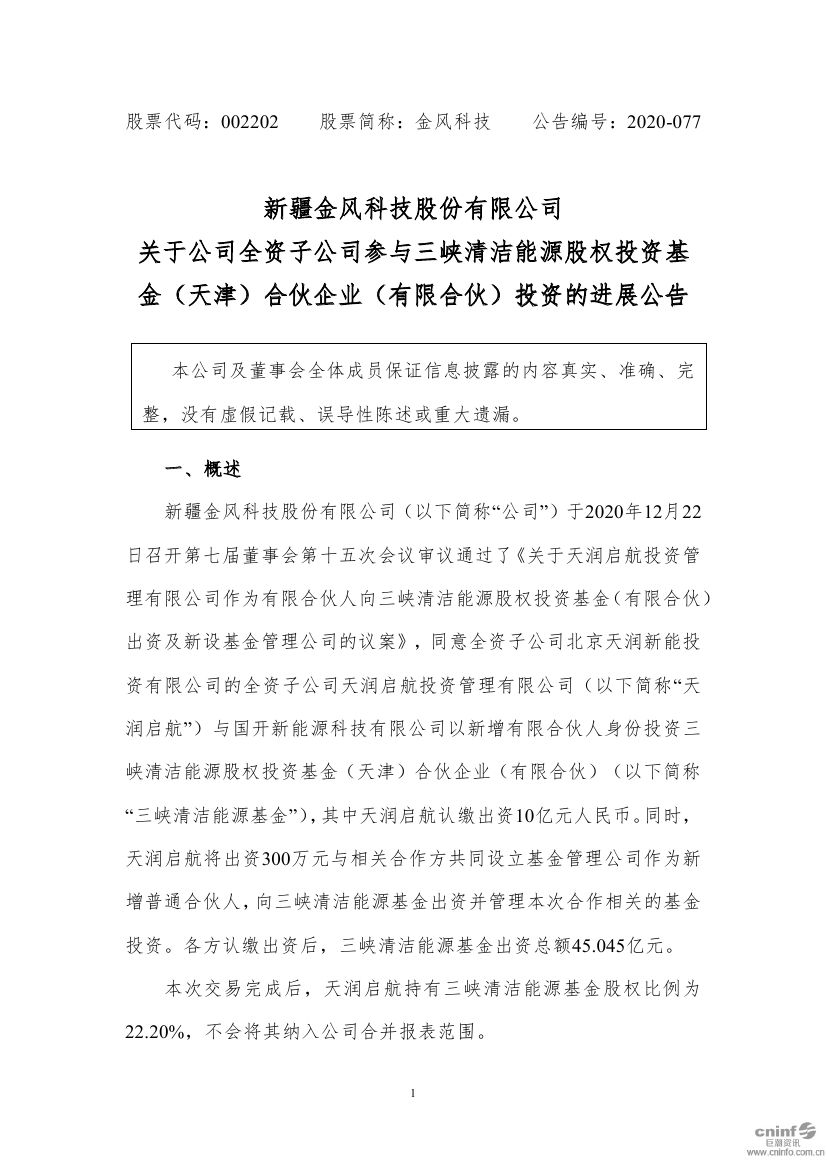 北极星风力发电网获悉,金风科技于2020年12月22日审议通过了《关于天润启航投资管理有限公司作为有限合伙人向三峡清洁能源股权投资基金(有限合伙)出资及新设基金管理公司的议案》。