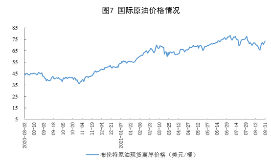 原油进口降幅继续收窄,国际原油价格略有回落。8月份,进口原油4453万吨,同比下降6.2%,降幅比上月收窄13.0个百分点;1—8月份,进口原油34636万吨,同比下降5.7%。8月份,国际油价仍在65美元/桶—75美元/桶区间震荡,8月31日,布伦特原油现货离岸价格为73.45美元/桶,比7月30日的77.72美元/桶下降5.5%。