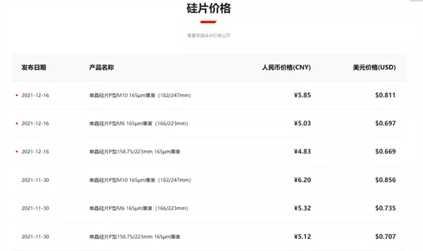 12月16日,隆基股份官网正式发布了单晶硅片的最新报价。