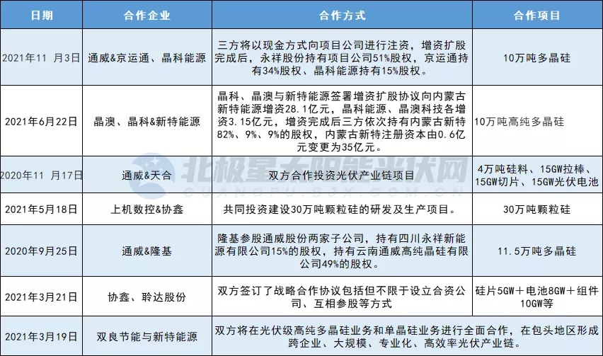 天合光能携手通威联合投资4万吨高纯晶硅、15GW拉棒项目、15GW切片项目及年产15GW高效晶硅电池项目,不仅填补了多晶硅空白领域,同时扩充了硅片环节。晶科同样联手通威共同投资了年产4.5万吨的多晶硅项目,同时战略入股内蒙古新特能源10万吨多晶硅项目。上机数控联合协鑫共同投资30万吨颗粒硅项目。