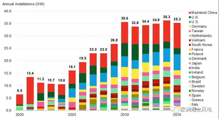 据彭博新能源预测,到2035年,全球海上风电累计装机将到到400GW,和2020年36GW的装机相比增长11倍。中国大陆、英国、美国、德国、荷兰将位居前五。(注:本文数据为BNEF统计,中国大陆有关数据可能与国家能源局后期发布数据有出入,但其它国家和地区装机准确度较高,具有更高参考价值。)