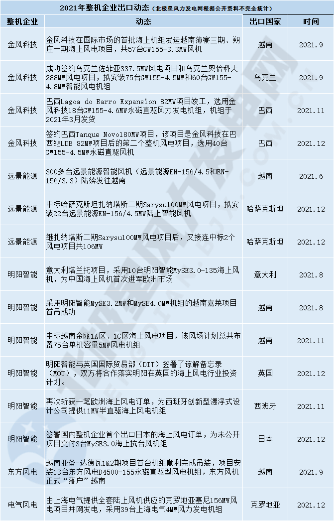 相较于往年多集中于“一带一路”沿线国家的出口形势,2021年我国风电企业走出去的步伐有所加快,出口供货量也远超往年。