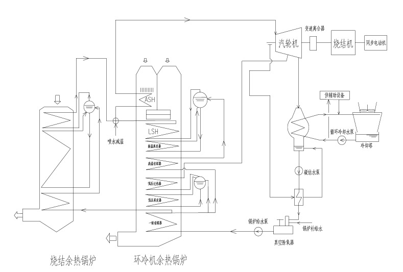 (1)烧结余热产生的废热通过余热锅炉产生蒸汽,再通过汽轮机转换为机械能,直接作用在轴系上,与电动机同轴驱动烧结主抽风机,提高能源利用效率;