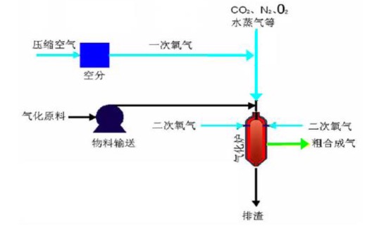 原料通过给料机和燃料喷嘴进入气化炉的第一段,采用纯氧作为气化剂,采用其它气体(如与氧气以任意比混合的二氧化碳,氮气,水蒸汽等)作为预混气体,调节控制第一段氧气的加入比例,使第一段的温度保证在灰熔点以下;在第二段再补充部分氧气,使第二段的温度达到煤的灰熔点以上,并完成全部气化过程。该技术的要点是:(1)氧气的分级供给,气化炉主烧嘴和侧壁氧气喷嘴分别加氧,使气化炉主烧嘴的氧气量可脱离炉内部分氧化反应所需的炭和氧的化学当量比约束;(2)由于氧气分级供给,可以采用氧含量从0%-100%的不同气体作为主烧嘴预混气体,调整火焰中心的温度和火焰中心的距离,降低气化炉主烧嘴端部的温度。