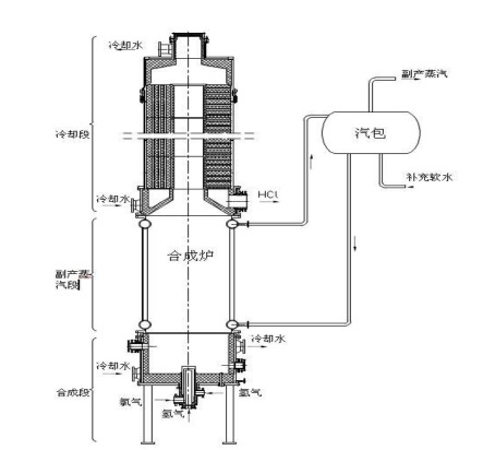氯气与氢气反应生成氯化氢时伴随释放出大量反应热,完全可以用来副产蒸汽。副产中压蒸汽合成炉在高温区段,使用钢制水冷壁炉筒;在合成段顶部和底部钢材容易受腐蚀的区段,采用石墨材料制作。采用这种方法既克服了石墨炉筒强度低和使用温度受限制的缺点,又克服了合成段的顶部和底部容易腐蚀的缺点,从而使氯化氢合成的热能利用率提高到70%,副产蒸汽压力可在0.2-1.4MPa间任意调节,可并入中、低压蒸汽网使用,使热能得到充分利用。