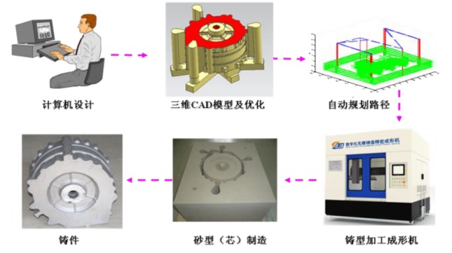 数字化无模铸造精密成形技术是一种全新的铸型制造方法。铸型制造是砂型铸造的关键工艺,决定铸件的质量和开发速度。本技术基本原理为:首先根据铸型三维CAD模型进行分模,并结合加工参数进行砂型切削路径规划;对规划好的路径模拟仿真,确保不会发生刀具干涉和砂型破坏;将砂坯置于加工平台上加工,产生的废砂被喷嘴吹出的气体排除。最后将加工的砂型单元砍合组装成铸型、浇注,得到合格金属件。不需要木模(金属模)等模具多工序翻制砂型,不需要拔模斜度和工艺补正量,减少了零部件设计中加工余量,节约了木材和金属消耗、降低了铸件能耗,实现了铸型设计、加工、组装过程数字化及工艺模拟和铸型数字化制造的无缝连接,实现了铸件生产的数字化、精密化、柔性化、自动化、绿色化。