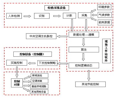 本技术采用RF射频技术、红外技术或热成像技术对人体移动热源(即建筑内移动用能负荷)进行监测,配合环境及气象参数采集、预置时间策略、能源管理策略与能耗数据分析模型构成的智能化室内节能控制系统;针对室内照明开关、供电插座、空调末端实施(无线)联网的、精细化节能管理;通过后台软件的集成管理,及时反馈末端的温湿度、开启状态、人数等,通过建立动态模型来联动BA系统,支持控制楼层风柜、新风机、中央冷冻站空调机组的开启、变频调节、温度调节,调整系统的控制策略,提升系统能效比;与其它建筑机电设备智能控制系统共同构筑完整的建筑整体节能控制系统。
