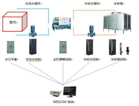 该技术以冷却塔变流量技术为前提,冷却塔模块根据采集的数据,在尽可能降低冷却水温度的前提下,使冷却塔风机节省电能;冷却泵模块根据采集的数据,控制冷却泵运转速度以及数量提高系统输送系数;主机策略模块根据冷机的特性,控制冷机工作在高效区;冷冻泵控制模块在双变流量技术的硬件支持下,达到末端与主机流量的互调,降低冷冻泵用电量;水力平衡模块负责调节各个支路的流量。利用配套研发的WISDOM平台,实现整个系统的智能化节能运行,其系统原理图见图1。