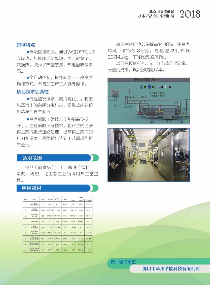 该技术采用纯化增压装置将废热蒸汽进行回收,运用低温蒸发技术将废热蒸汽中的杂质分离出来,提取热能并输出洁净再生蒸汽。通过蒸汽膨胀压缩技术,将产生的洁净再生蒸汽进行压缩处理,提高再生蒸汽的 压力和温度,输出达到工艺需求的再生蒸汽。采用该技术可以大量回收热工艺过程中产生的废热蒸汽,节能率大于 30%。