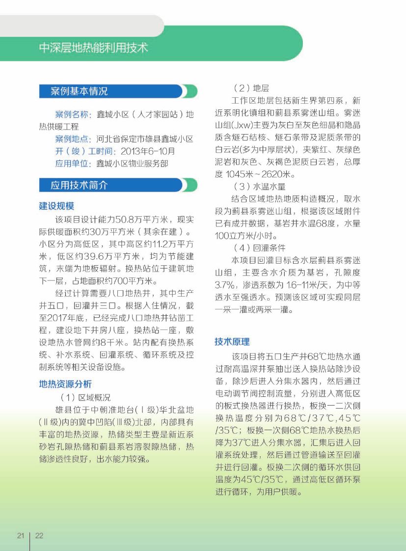 该技术利用地热水采灌均衡技术、管网水力平衡技术和间接换热技术,利用中深层地下热水对二次侧供暖循环水进行加热,满足建筑物冬季供暖需求。该技术运用非取水段水泥全封固方式和地热尾水回灌技术,防止深部地热水窜层污染浅部水源以及地热水对小区管网、末端的腐蚀。